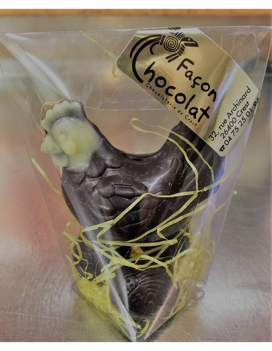 Des petits moulages de Pâques : poule, lapin, cloche, en chocolat noir doux, accompagnés de friture et/ou petit oeuf en assortiment 50 g.