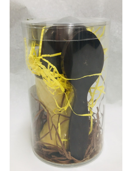 Oeuf (environ 20 g) et cuillère (environ 10 g) : chocolat noir à 67% cacao minimum, sucre blond de canne