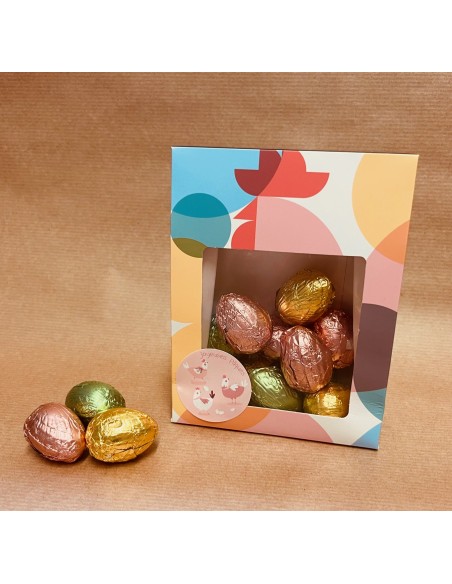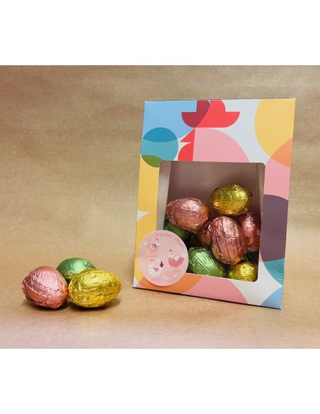 Un joli ballotin aux couleurs de Pâques garnis d'un bel assortiment de petits oeufs en chocolat noir doux (110g).