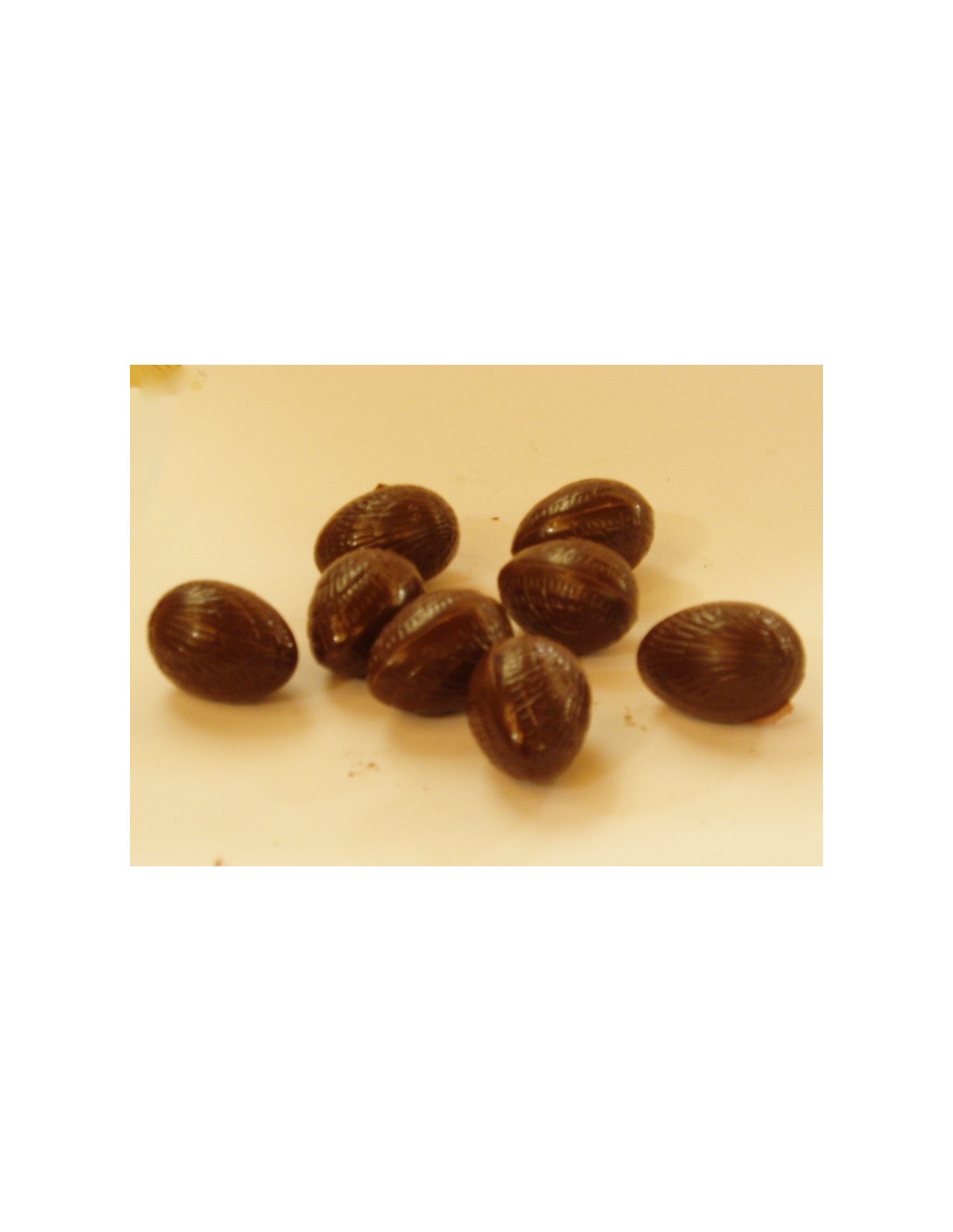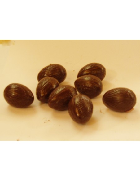 Les petits oeufs ont tous une coque en chocolat noir doux (67% cacao) et sont fourrés :