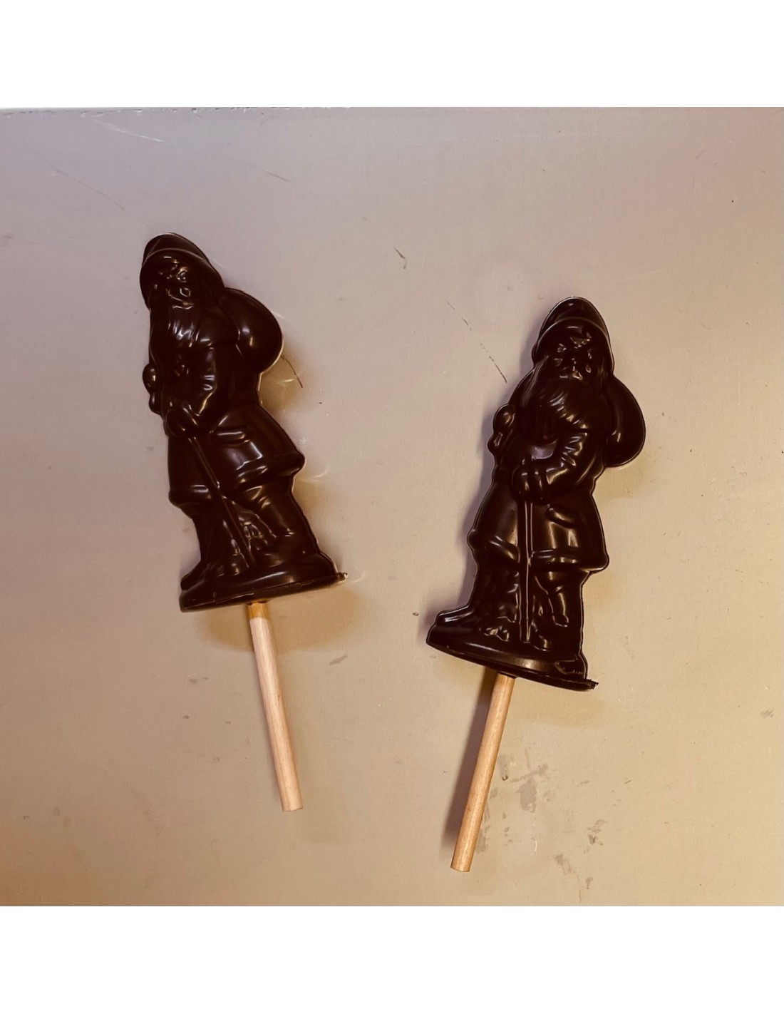 Sucette Père Noël en chocolat noir doux garni de notre délicieux praliné noisette maison.